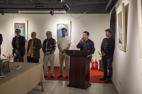 开幕式由现代彩墨艺术馆执行馆长黄润宇主持。随后,学术主持王雪峰为画展开幕式致辞,分别从作品的形式及色彩方面解读了徐开君极具装饰味的彩墨禅意画。其装饰的形来自于他生长的地方——江苏连云港,又名海州,那里是一个文化底蕴深厚的地方,可看到原始时期的将军崖岩画,还能在孔望山看到从汉代到魏晋时期的摩崖造像,除此以外,还有很多历代的摩崖石刻,可以说,地域的文化元素对他艺术形象的生成有着不可磨灭的影响,此外,不少来自历史长河中的图像资源也成为他绘画形象的来源,如民间绘画中的造型在他的作品中就得到了体现。第二是装饰的色彩,他的艺术作品色彩鲜明、厚重,极具特色。运用大块的冷暖色调对比及黑白色进行调节,使他的画作具有强烈的装饰意味。其色彩深受传统壁画色彩的影响。王雪峰谈到,在这图像背后,更重要的是徐开君对禅宗和他的世界观、人生观、价值观的体现。通过对画作的解读就能够走进画家的内心世界。随后,叶星生、蔡大礼、大泽人、庞龙、赵东分别致辞,从不同角度阐释了徐开君的绘画艺术风格,从他对事物独到的理解和艺术表现方式上给与了艺术家高度评价。
