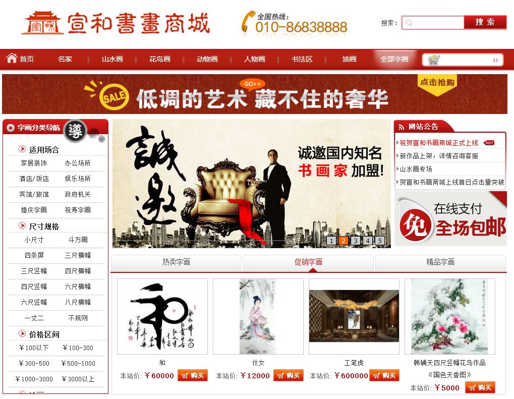 宣和书画商城是中国国画、字画、山水画、花鸟画、人物画、动物画、装饰画、书法等的专业网上字画商城。书画家手绘真迹、亲笔签名保真证书,为您带来不可估量的升值、保值、鉴赏和收藏价值。欢迎各位艺术家老师加盟入驻。